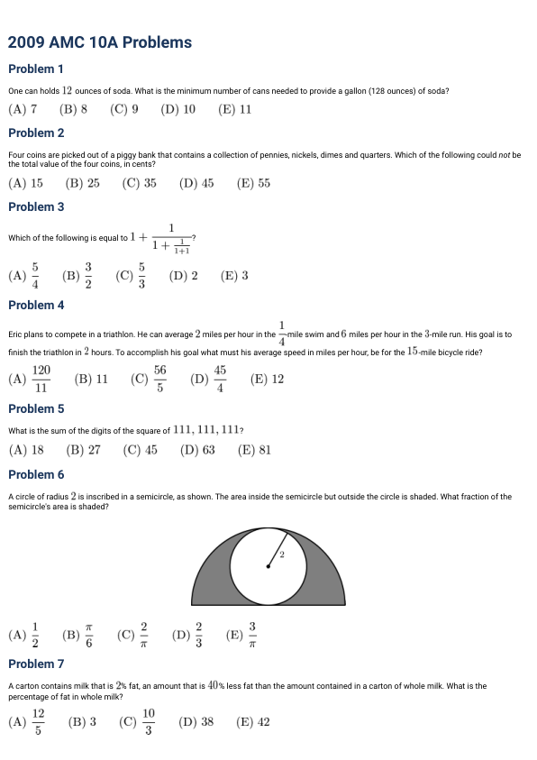 Problem 1 One can holds 12 ounces of soda, what is the minimum number of cans needed to provide a gallon (128 ounces) of soda? 一个杯子可以装 12 盎司的汽水,那么需要多少个杯子才能提供一加仑(128 盎司)的汽水? (A) 7 (B) 8 (C) 9 (D) 10 (E) 11 Solution 1 10 cans would hold 120 ounces, but 128 > 120, so 11 cans are required. Thus, the answer is (E) 11. 10 个杯子可以装 120 盎司,但是 128 > 120,所以需要 11 个杯子。因此,答案是 (E) 11。 Solution 2 We want to find \left\lceil \frac{128}{12} \right\rceil because there are a whole number of cans. 我们想要找到 \left\lceil \frac{128}{12} \right\rceil ,因为杯子的数量必须是整数。 \frac{128}{12} = 10R8 → 11 → (E). Problem 2 The following problem is from both the 2009 AMC 12A #4 and 2009 AMC 10A #2, so both problems redirect to this page. 下面的问题是来自2009年AMC 12A第4题和2009年AMC 10A第2题,所以这两个问题都重定向到这个页面。 Four coins are picked out of a piggy bank that contains a collection of pennies, nickels, dimes, and quarters. Which of the following could not be the total value of the four coins, in cents? 从一个装有分币、五分币、一角币和二角五分币的猪形储蓄罐中挑出四枚硬币。以下哪一项不可能是这四枚硬币的总价值(以分为单位)? (A) 15 (B) 25 (C) 35 (D) 45 (E) 55 Problem 3 The following problem is from both the 2009 AMC 12A #2 and 2009 AMC 10A #3, so both problems redirect to this page. 这个问题既来自2009年AMC 12A第2题,也来自2009年AMC 10A第3题,因此这两个问题都重定向到这个页面。 Which of the following is equal to 1 + \frac{1}{1 + \frac{1}{1 + 1}}? 以下哪一项等于 1 + \frac{1}{1 + \frac{1}{1 + 1}}? (A) \frac{5}{4} (B) \frac{3}{2} (C) \frac{5}{3} (D) 2 (E) 3 Solution