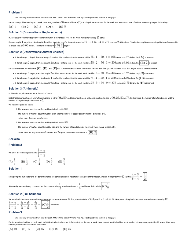 Problem 1 The following problem is from both the 2009 AMC 10B #1 and 2009 AMC 12B #1, so both problems redirect to this page. Each morning of her five-day workweek, Jane bought either a $50$-cent muffin or a $75$-cent bagel. Her total cost for the week was a whole number of dollars. How many bagels did she buy?