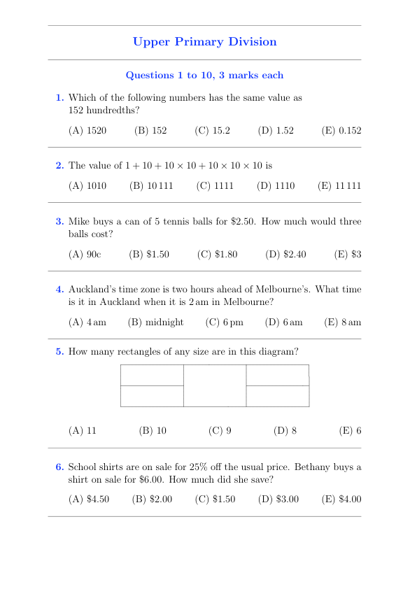 Upper Primary Division Questions 1 to 10, 3 marks each 1. Which of the following numbers has the same value as 152 hundredths? (A) 1520 (B) 152 (C) 15.2 (D) 1.52 (E) 0.152 2. The value of 1 + 10 + 10 × 10 + 10 × 10 × 10 is (A) 1010 (B) 10111 (C) 1111 (D) 1110 (E) 11111 3. Mike buys a can of 5 tennis balls for $2.50. How much would three balls cost? (A) 90c (B) $1.50 (C) $1.80 (D) $2.40 (E) $3 4. Auckland’s time zone is two hours ahead of Melbourne’s. What time is it in Auckland when it is 2 am in Melbourne? (A) 4 am (B) midnight (C) 6 pm (D) 6 am (E) 8 am 5. How many rectangles of any size are in this diagram? (A) 11 (B) 10 (C) 9 (D) 8 (E) 6 6. School shirts are on sale for 25% off the usual price. Bethany buys a shirt on sale for $6.00. How much did she save? (A) $4.50 (B) $2.00 (C) $1.50 (D) $3.00 (E) $4.00