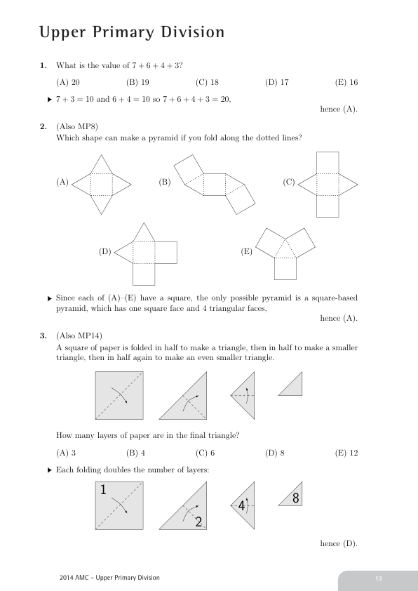 Upper Primary Division Questions 1 to 10, 3 marks each 1. What is the value of 7 + 6 + 4 + 3? (A) 20 (B) 19 (C) 18 (D) 17 (E) 16 2. Which shape can make a pyramid if you fold along the dotted lines? (A) (B) (C) (D) (E) 3. A square of paper is folded in half to make a triangle, then in half to make a smaller triangle, then in half again to make an even smaller triangle. How many layers of paper are in the final triangle? (A) 3 (B) 4 (C) 6 (D) 8 (E) 12