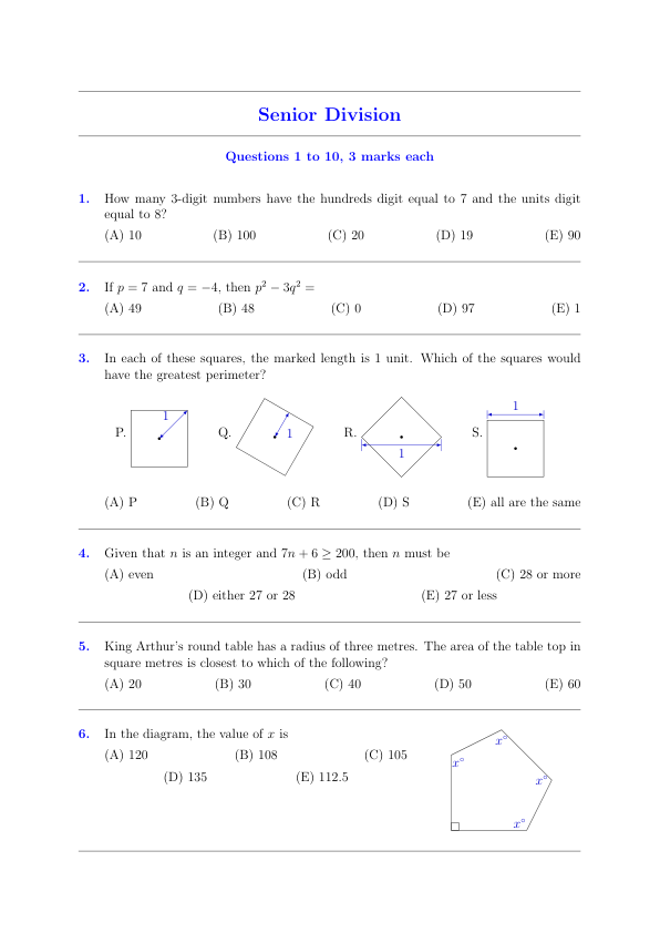 3. 在下面的这些正方形中,标记的长度都是 1 单位长。请问哪一个正方形的周长最长? In each of these squares, the marked length is 1 unit. Which of the squares would have the greatest perimeter? (A) P (B) Q (C) R (D) S (E) all are the same