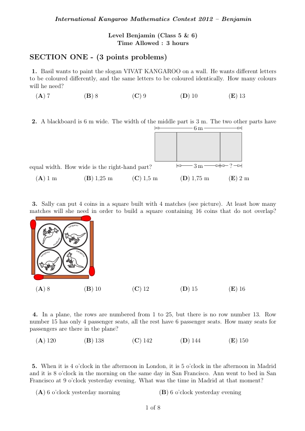 International Kangaroo Mathematics Contest 2012 - Benjamin Level Benjamin (Class 5 & 6) Time Allowed : 3 hours SECTION ONE - (3 points problems) 1. Basil wants to paint the slogan VIVAT KANGAROO on a wall. He wants different letters to be coloured differently, and the same letters to be coloured identically. How many colours will he need? (A) 7 (B) 8 (C) 9 (D) 10 (E) 13 2. A blackboard is 6 m wide. The width of the middle part is 3 m. The two other parts have equal width. How wide is the right-hand part? (A) 1 m (B) 1,25 m (C) 1,5 m (D) 1,75 m (E) 2 m 3. Sally can put 4 coins in a square built with 4 matches (see picture). At least how many matches will she need in order to build a square containing 16 coins that do not overlap? (A) 8 (B) 10 (C) 12 (D) 15 (E) 16 4. In a plane, the rows are numbered from 1 to 25, but there is no row number 13. Row number 15 has only 4 passenger seats, all the rest have 6 passenger seats. How many seats for passengers are there in the plane? (A) 120 (B) 138 (C) 142 (D) 144 (E) 150 5. When it is 4 o'clock in the afternoon in London, it is 5 o'clock in the afternoon in Madrid and it is 8 o'clock in the morning on the same day in San Francisco. Ann went to bed in San Francisco at 9 o'clock yesterday evening. What was the time in Madrid at that moment? (A) 6 o'clock yesterday morning (B) 6 o'clock yesterday evening 1 of 8