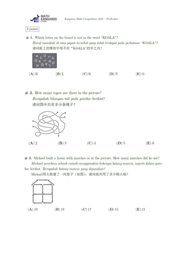 MATH KANGAROO CHINA Kangaroo Math Competition 2016 - PreEcolier 3 points #1. Which letter on the board is not in the word “KOALA”? Huruf manakah di atas papan tersebut yang tidak terdapat pada perkataan “KOALA”? 请问板上的哪些字母不在“KOALA”的字之内? (A) R (B) L (C) K (D) N (E) O #2. How many ropes are there in the picture? Berapakah bilangan tali pada gambar berikut? 请问图中共有多少条绳子? (A) 2 (B) 3 (C) 4 (D) 5 (E) 6 #3. Michael built a house with matches as in the picture. How many matches did he use? Michael membina sebuah rumah menggunakan beberapa batang mancis, seperti dalam gambar berikut. Berapakah batang mancis yang digunakan? Michael用火柴建了一间屋子(如图)。请问他共用了多少根火柴? (A) 19 (B) 18 (C) 17 (D) 15 (E) 13