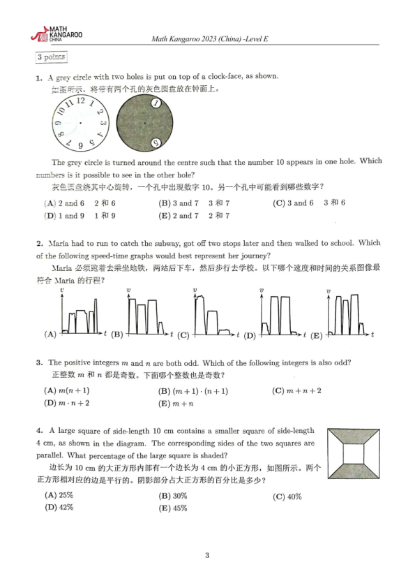 MATH KANGAROO CHINA Math Kangaroo 2023 (China)-Level E 3 points 1. A grey circle with two holes is put on top of a clock-face, as shown. 如图所示,将带有两个孔的灰色圆盘放在钟面上。 The grey circle is turned around the centre such that the number 10 appears in one hole. Which numbers is it possible to see in the other hole? 灰色圆盘绕其中心旋转,一个孔中出现数字10。另一个孔中可能看到哪些数字? (A) 2 and 6 2和6 (B) 3 and 7 3和7 (C) 3 and 6 3和6 (D) 1 and 9 1和9 (E) 2 and 7 2和7 2. Maria had to run to catch the subway, got off two stops later and then walked to school. Which of the following speed-time graphs would best represent her journey? Maria 必须跑着去乘坐地铁,两站后下车,然后步行去学校。以下哪个速度和时间的关系图象最符合Maria 的行程? (A) (B) (C) (D) (E) 3. The positive integers m and n are both odd. Which of the following integers is also odd? 正整数m 和n 都是奇数。下面哪个整数也是奇数? (A) m(n+1) (B) (m+1)(n+1) (C) m+n+2 (D) m·n+2 (E) m+n 4. A large square of side-length 10 cm contains a smaller square of side-length 4 cm, as shown in the diagram. The corresponding sides of the two squares are parallel. What percentage of the large square is shaded? 边长为10 cm的大正方形内部有一个边长为4 cm的小正方形,如图所示。两个正方形相对应的边是平行的。阴影部分占大正方形的百分比是多少? (A) 25% (B) 30% (C) 40% (D) 42% (E) 45% 3